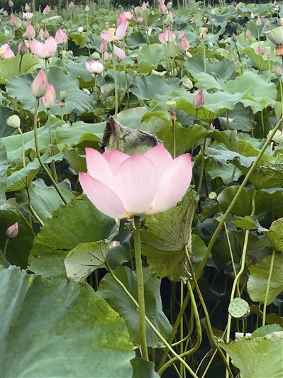 現(xiàn)場(chǎng)作畫 ?鳳凰木下百荷開,送走了五月里紅火的鳳凰花,六七月便輪到荷花登場(chǎng)。連日來(lái),賴店鎮(zhèn)象林村萬(wàn)株荷花精彩綻放,吸引大批游客駐足賞花。 ?象林村的荷花千姿百態(tài),潔白無(wú)瑕,水晶一樣純潔。如同清純的少女,不施粉黛天然現(xiàn)一段風(fēng)韻,素面朝天自在露幾分嬌羞,嫻靜從容,顧盼生情。一縷風(fēng)過(guò),荷花韻味濃郁,清香撲鼻。田田荷葉之下,魚兒或自由自在,或競(jìng)相逐食,給人動(dòng)靜相宜之感。 ?層層的葉子中間,零星地點(diǎn)綴著些白花,有裊娜地開著的,有羞澀地打著朵兒的,正如一粒粒的明珠,又如碧天里的星星,又如剛出浴的美人。 ?記者看到,荷花散發(fā)出清新淡雅的芬芳,引來(lái)蜜蜂飛舞,令人賞心悅目,而那調(diào)皮的蜻蜓,扇動(dòng)著翅膀,從一朵花飛到另一朵花,與荷花快樂(lè)地嬉戲著,此外,還有小鳥藏在荷花下躲雨。 ?“看來(lái)這個(gè)周末,我要帶孩子來(lái)象林村的荷花池賞花了,順便做個(gè)荷花仙子。”正在賞花的市民李娜彬說(shuō),荷花代表圣潔,更有“出淤泥而不染,濯清漣而不妖”的美言,可以讓孩子盡情親近自然,賞荷觀花。 ?據(jù)了解,象林村的荷花會(huì)在6月下旬至7月初這個(gè)時(shí)間段迎來(lái)盛花期,屆時(shí)將開得最艷。 |