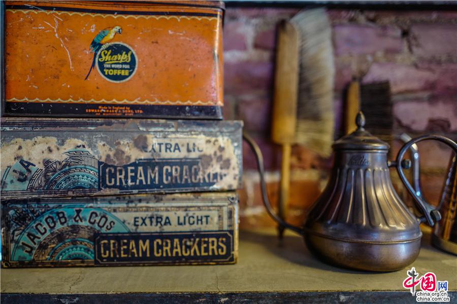 還有幾家雜貨鋪一樣的“古董”店,它不像是店,更像是舊時生活陳設館,在這里能找到通往過去的密匙——一個掛在窗戶的布偶;放在地上的搪瓷盆;一件軍大衣,就能點燃心中屬于那個年代記憶的火。