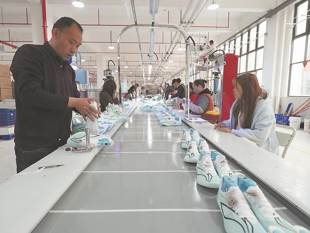 “李寧”鞋類產(chǎn)品研發(fā)中心,工人正在流水線上作業(yè)。林鵬 攝